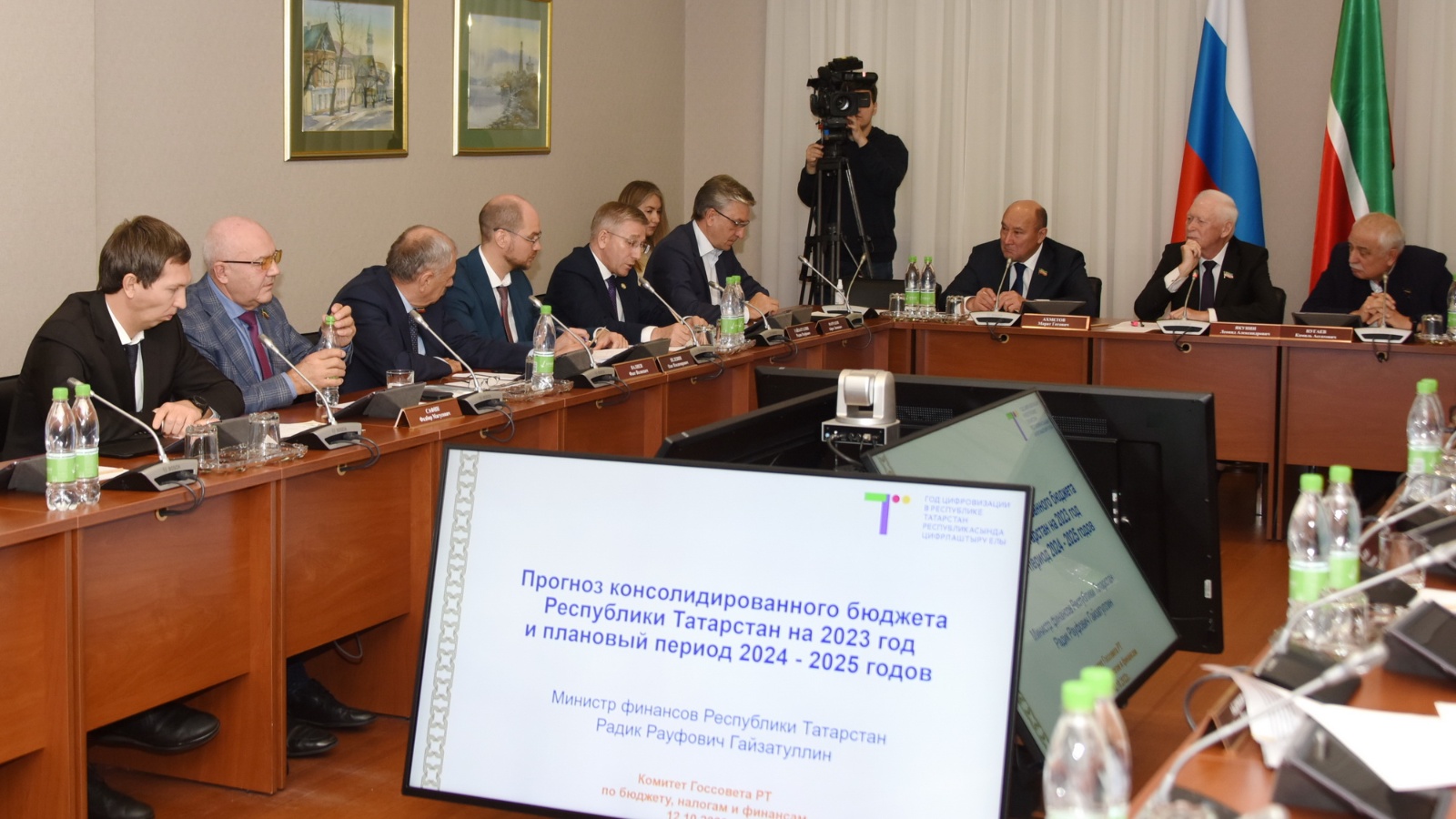 Республика икътисады үсешенең фаразланган күрсәткечләре һәм бюджетның төп параметрлары буенча докладлар белән икътисад министрының беренче урынбасары Олег Пелевин һәм финанслар министры Радик Гайзатуллин чыгыш ясады.