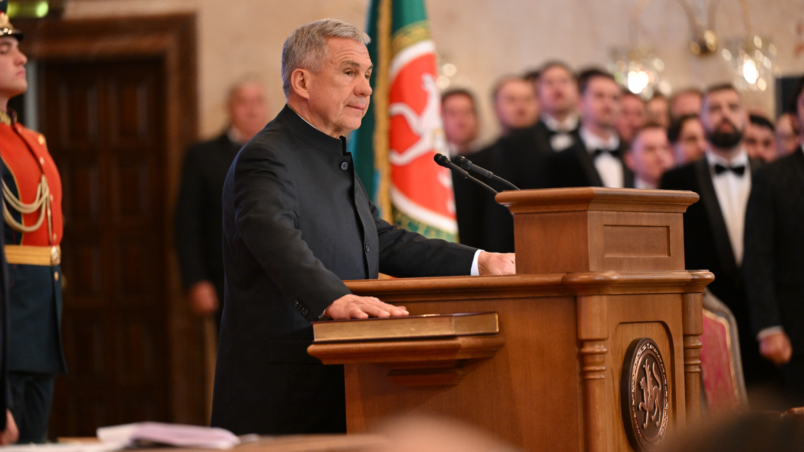 Хөрмәтле тантанада катнашучылар һәм кунаклар! Мөхтәрәм ватандашлар! Татарстан Республикасы Рәисе вазыйфасына керешкәндә, барыннан да элек, гражданнарыбызга күрсәткән ышанычлары өчен рәхмәт белдерәсем килә. Татарстанның күп милләтле халкы сайлавын кабул итеп, республиканың барлык халкы алдында, гореф-гадәтләрне, кыйммәтләрне һәм туган җиргә мәхәббәтне саклап калган һәм безгә тапшырган ата-бабалар, шулай ук киләчәк буыннар алдында язмышы өчен җаваплы булуымны аңлыйм. Бөек Ватан сугышы елларында азатлыкны саклаган барлык Ватанны саклаучыларга һәм бүген махсус хәрби операция барышында ил иминлеге өчен көрәшүче аларның варисларына баш иябез. һәр ветеранның, һәр Ватанны саклаучының һәм аларның гаиләләренең иминлеген тәэмин итү – шәхсән минем һәм шулай ук барлык хакимият органнарының бурычы.